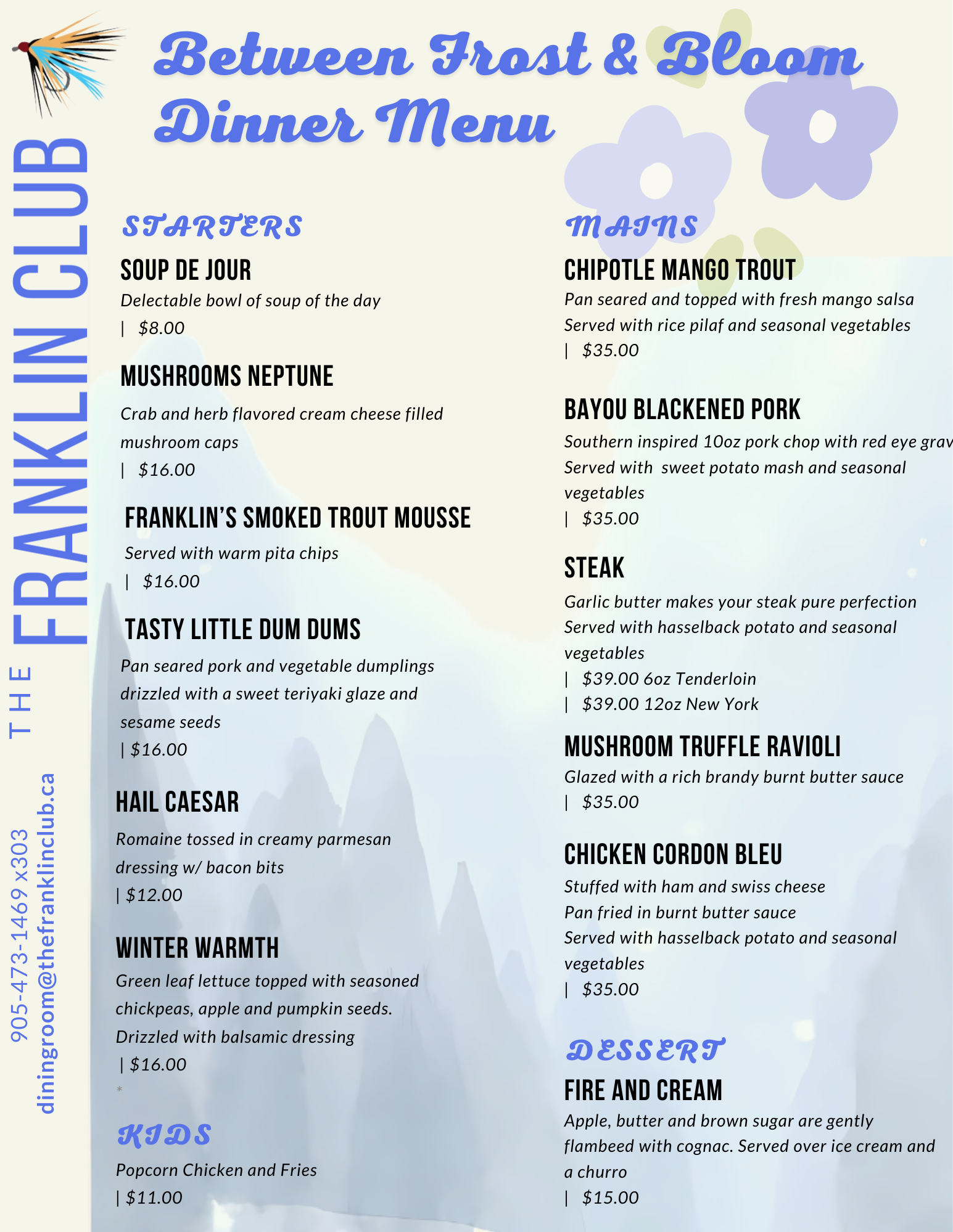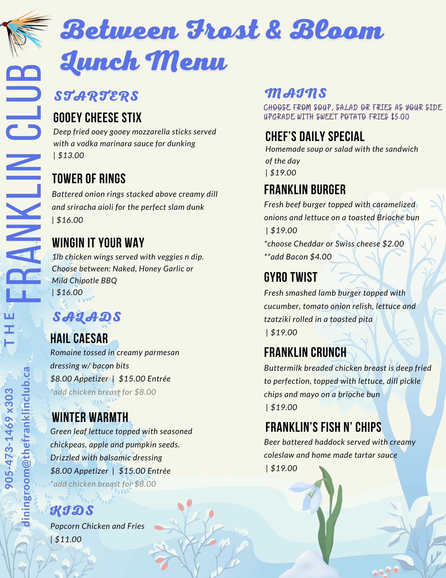The Clubhouse has its own Dining Room available to serve members and their guests. The facility can be booked in advance for larger gatherings and special events. From Wednesday through Sunday, you can enjoy a variety of splendid meals for lunch or dinner. Dining service generally is available on Holiday Mondays. Weather depending, enjoy your meal on our large deck overlooking the beautiful Franklin Lake.
